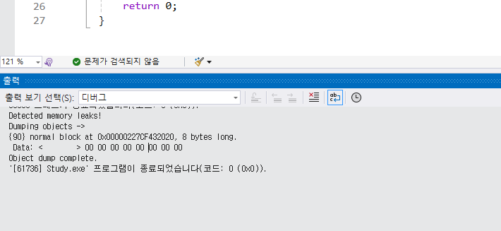 이 코드를 실행한 후 디버그 창을 보면 메모리 릭이 나는 것을 아래와 같이 확인할 수 있다.