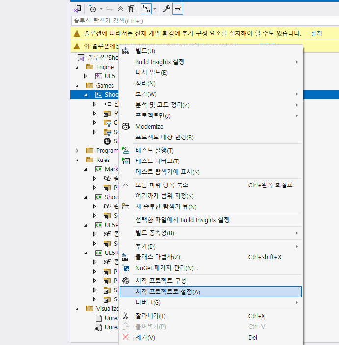 언리얼 C++ 프로젝틀르 비주얼 스튜디오를 사용할 때는 시작프로젝트로 설정을 해줘야한다.