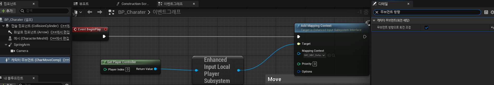 캐릭터가 움직이는 방향으로 회전하지 않길래 설정을 다시보니
