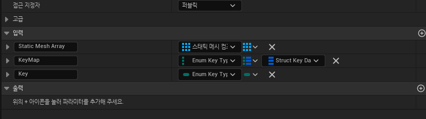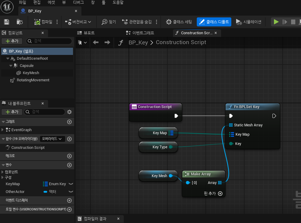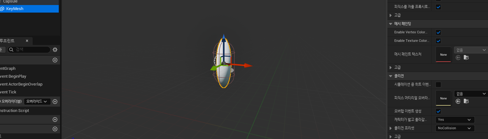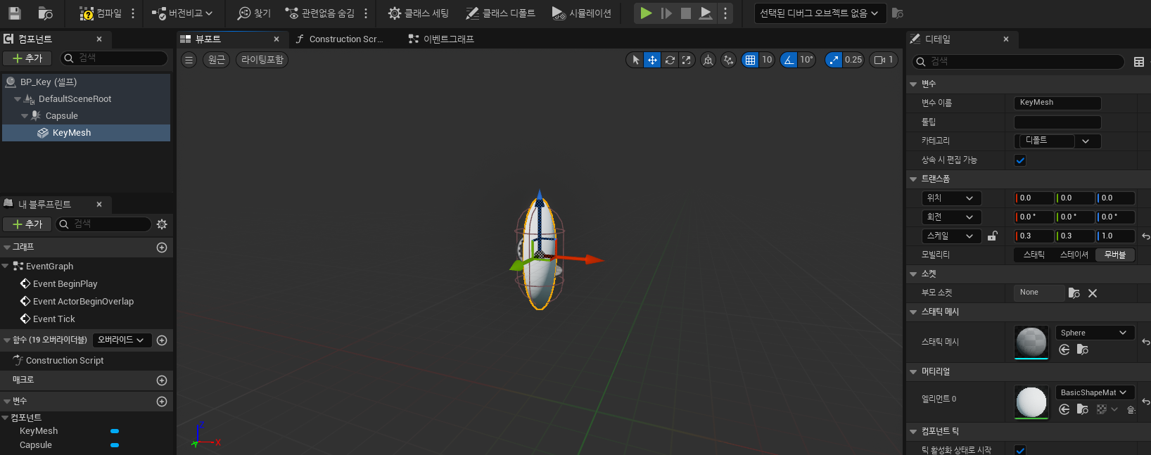 - 요약 : 캡슐 컴포넌트 추가 -> 프로퍼티 구성(Enum Key Type) -> 키 타입을 셰이프와 컬러에 매핑 -> 블루프린트 함수 라이브러리에 Set Static Mesh, Set Material 함수 생성